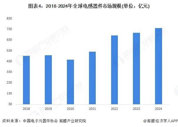 全球电子信息产业迅速发展,作为产业发展必不可少的基础电子元件之一的电感器也在不断推陈出新,无论是在应用还是产品性能与品质方面都在快速地进行升级换代。根据中国电子元件行业协会公布的数据,近年来全球电感器件受手机、汽车等终端需求不振,且受全球新冠疫情影响,2019年增长进入颓势,2020年呈现下滑。自2021年起,全球市场逐渐恢复,2023年全球电感器件市场规模约为696亿元,结合历史数据初步估计2024年全球电感器件市场规模约为740亿元。