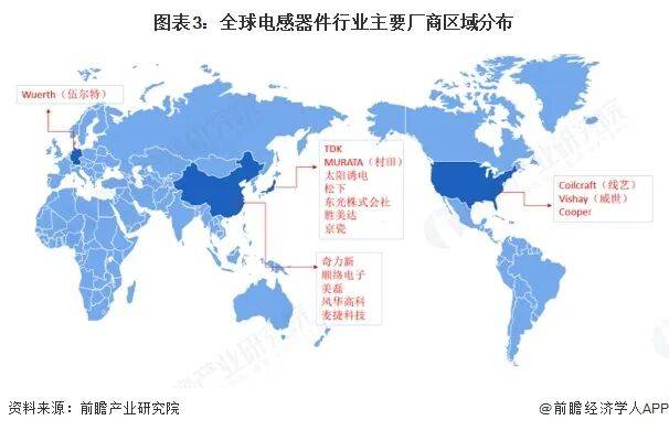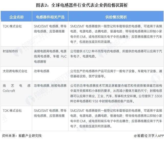 从全球电感器件行业代表企业供给情况来看,各家电感器件生产企业的产品主要提供给汽车制造、医疗设备制造、电子产品制造、航空航天制造等行业的客户。从全球电感器件行业主要厂商区域分布来看,目前全球电感市场主要由日系厂商主导,中国、美国、德国也为全球电感器件行业重要市场。