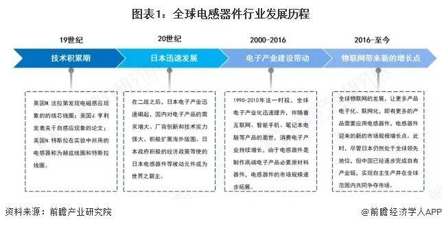 全球电感器件发展历程可以分为四个阶段,技术积累期、日本迅速发展阶段、电子产业建设带动行业规模扩大,以及物联网为电感器件行业发展带来新的增长点。在19世纪,最原始的电感器是1831年英国M.法拉第用以发现电磁感应现象的铁芯线年美国的J.亨利发表关于自感应现象的论文。人们把电感量的单位称为亨利,简称亨。19世纪中期,电感器在电报、电话等装置中得到实际应用。1887年德国的H.R.赫兹,1890年美国N.特斯拉在实验中所用的电感器都是非常著名的,分别称为赫兹线世纪,日本电子产业迅速崛起,得益于日本国内电子产品需求增大、厂商创新能力、政府经济支持,日本电感器件行业成为世界霸主。到了二十世纪初期,电子产业建设带动电感器件的发展。如今物联网是全球发展新趋势,这又为电感器件的发展带来新的增长点。