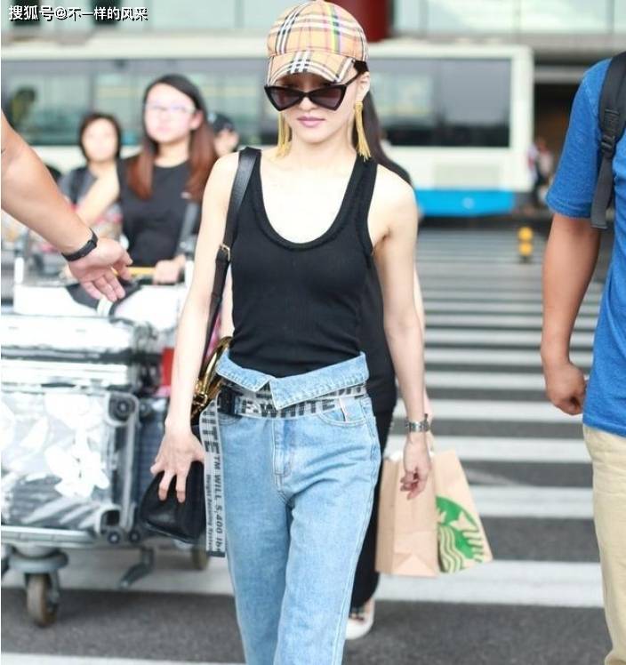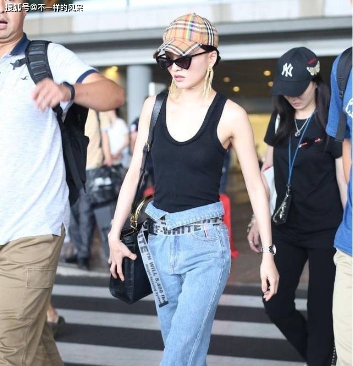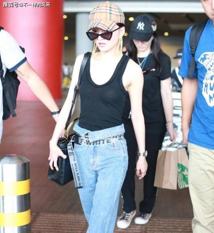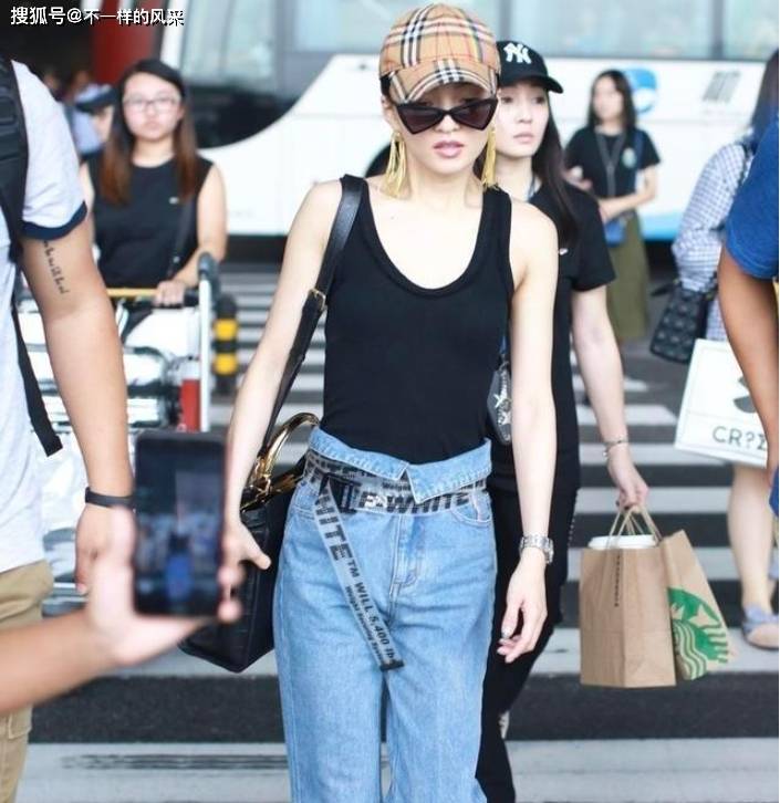 先瞧瞧她那次现身机场的造型,黑色背心搭配高腰牛仔裤,简直绝了!高腰牛仔裤自带硬朗复古的气质,碰上基础款的黑色背心,就像两个武林高手过招,瞬间碰撞出时尚的火花。再加上那对金穗大耳环,随着步伐摇曳生姿,细节之处尽显魅力,让她走在路上,回头率爆表,仿佛自带 “时尚女王” 的气场。